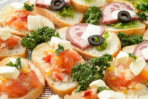 フランスパン、クリームチーズ、プチビーフガランティン、パセリ、ブラックオリーブ、サーモンマリネジュレ