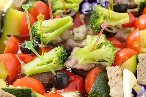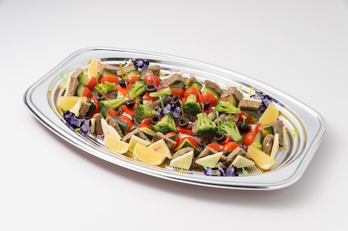 炭火焼きハンバーグ、ミックス野菜、ブロッコリー、ミニトマト、レモン、ブラックオリーブ、鴨炭火焼、チーズ、食用花