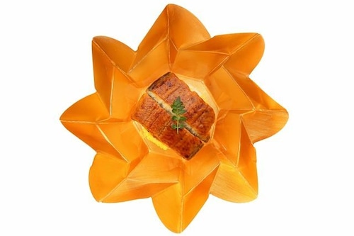 金色の花がパッと咲いたように開く、別添えのご飯が印象的な一品。