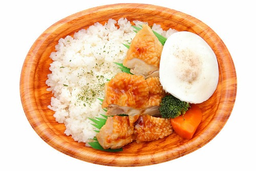 おしながき:鶏照り揚げプレート(白米200g、鶏照り焼き、目玉焼き、ブロッコリー、人参)