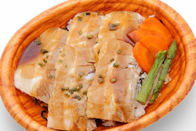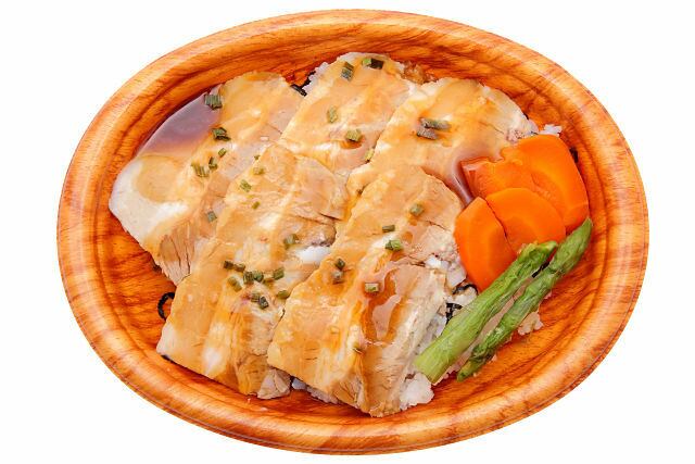 おしながき:チャーシュー丼(白米200g、自家製チャーシュー、にんじん、アスパラ)